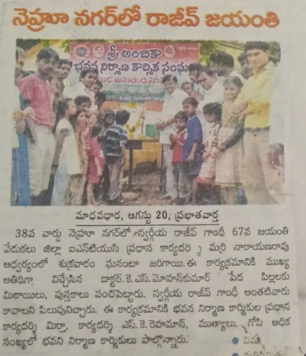 The chief guest for the program was Dr. K.S. Mohan Kumar, who distributed notebooks and stationery to poor students. He recalled Rajiv Gandhi’s services to the nation and his vision for the future of India. Prominent attendees who contributed to the success of the event included S.K. Rehman, Murthy, and other community leaders involved in housing development and local welfare activities.